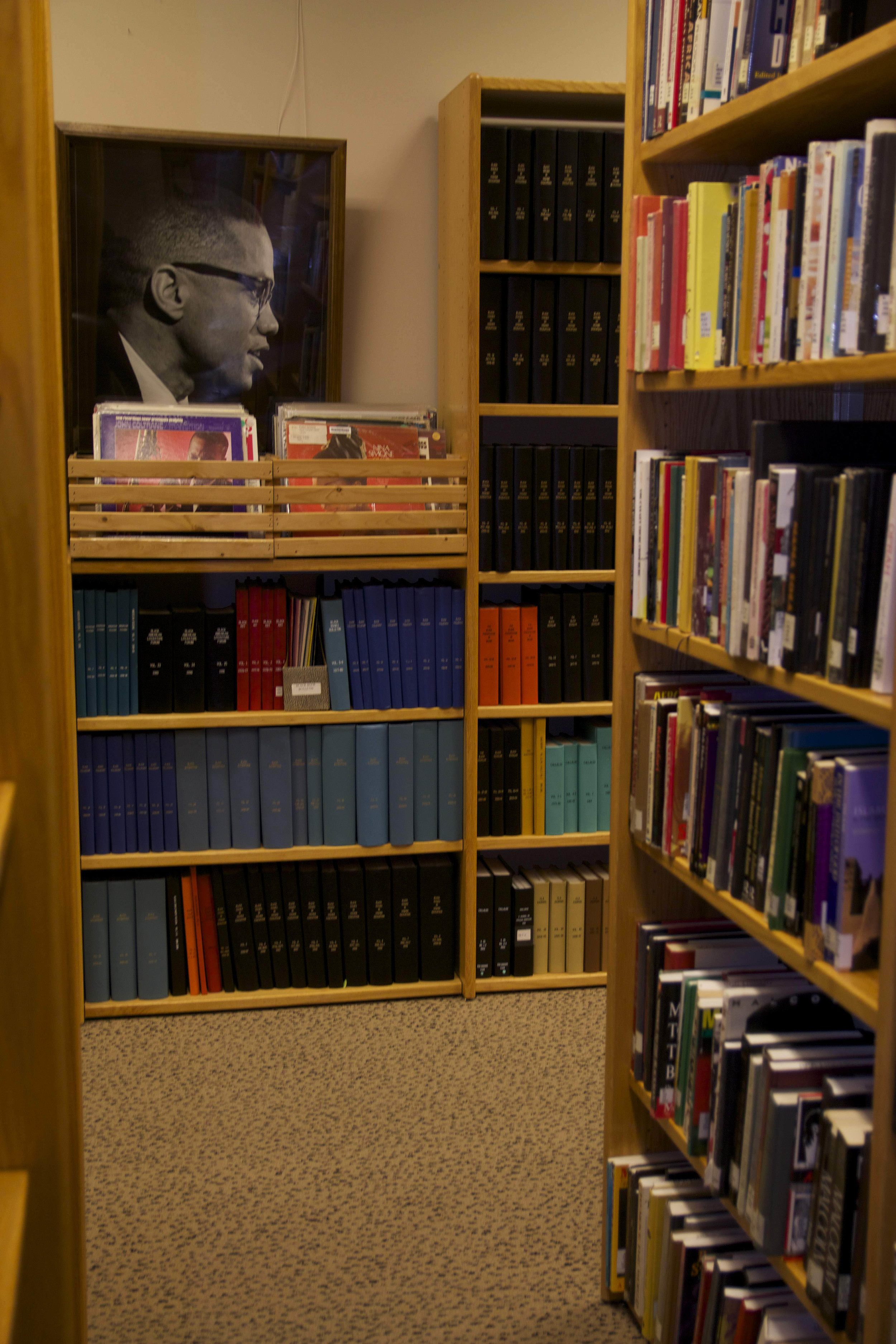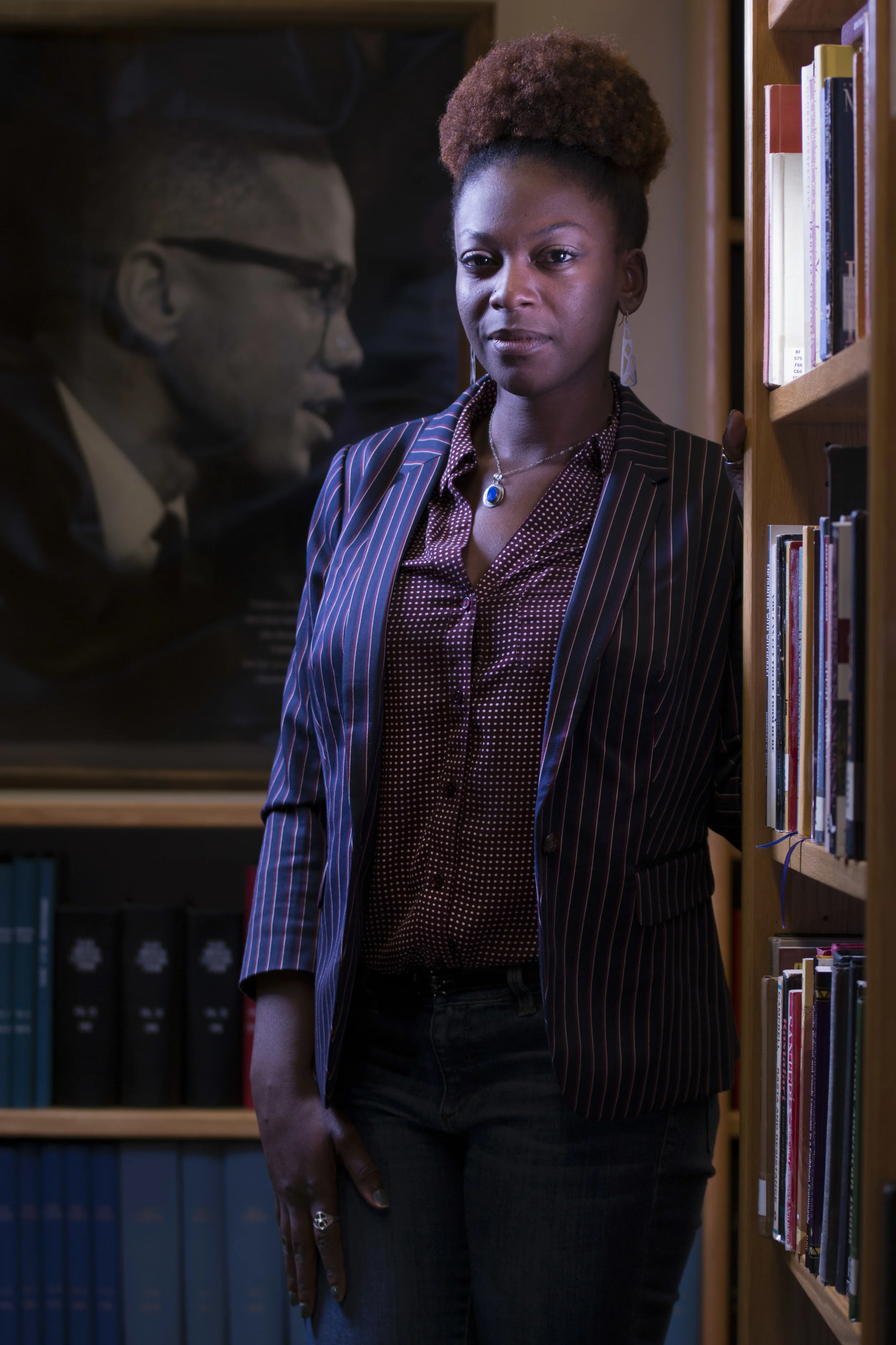 I recently met Kadari earlier on this semester. After she accepted my request to photograph her as part of my project, I decided that the location I wanted to frame her in was the location where we initially met. This was the BCC on campus, in particular the upstairs Library of the BCC. I knew that I wanted to include books in the frame to represent the aspect of her that is astute. When I looked around the library a few days prior I spotted a framed picture of Malcolm X on the back wall behind some records. I asked for permission to both shoot in the library with strobe lighting and also to temporarily remove the records blocking the image of Malcolm by the wall (see image below).